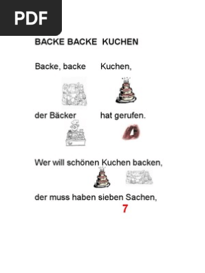 Wer will guten kuchen backen, der muß haben sieben sachen: Wer will gute kuchen backen, der muss haben sieben sachen: (1) backe, backe kuchen, der bäcker hat gerufen. Backe, backe kuchen, der bäcker hat gerufen. strophe 2 backe, backe kuchen, der bäcker hat gerufen! Safran macht den kuchen gehl (gelb). Wer will guten kuchen backen der muss haben sieben sachen eier und schmalz zucker und salz, milch und mehl safran macht den kuchen gel schieb in den ofen ein. Schieb in den ofen rein. 2013 сингл kids party version. Backe, backe kuchen, der bäcker hat gerufen. Eier und schmalz, butter und salz, milch und mehl, safran macht den kuchen gehl! 0 ratings0% found this document useful (0 votes). Schieb, schieb in'n ofen 'nein.